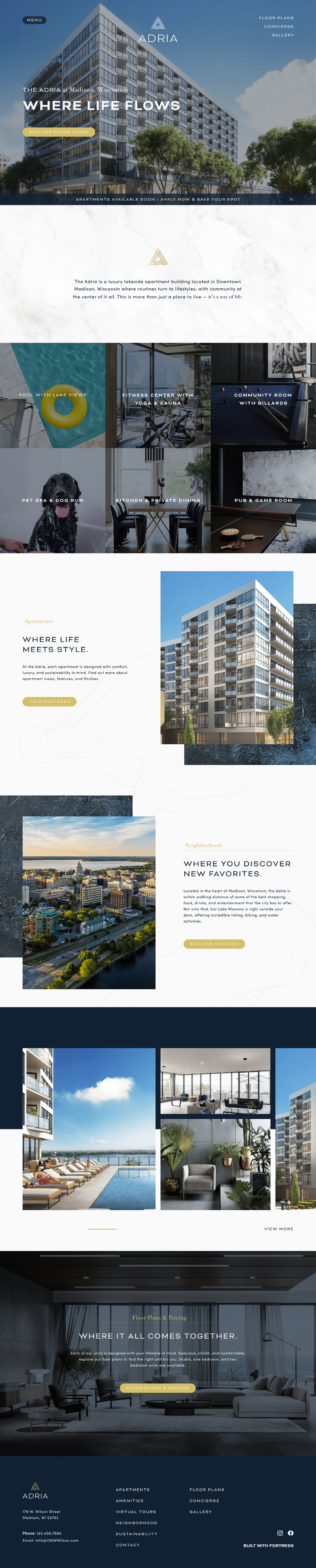 The Adria is a brand new, state-of-the-art apartment building in the heart of Madison Wisconsin’s downtown district. Fortress went to work orchestrating everything from the name and brand of the building to the backend development of the website, and every marketing effort in between. We are excited for The Adria to be introduced to its target market of younger professionals when the building opens its doors in summer 2023.