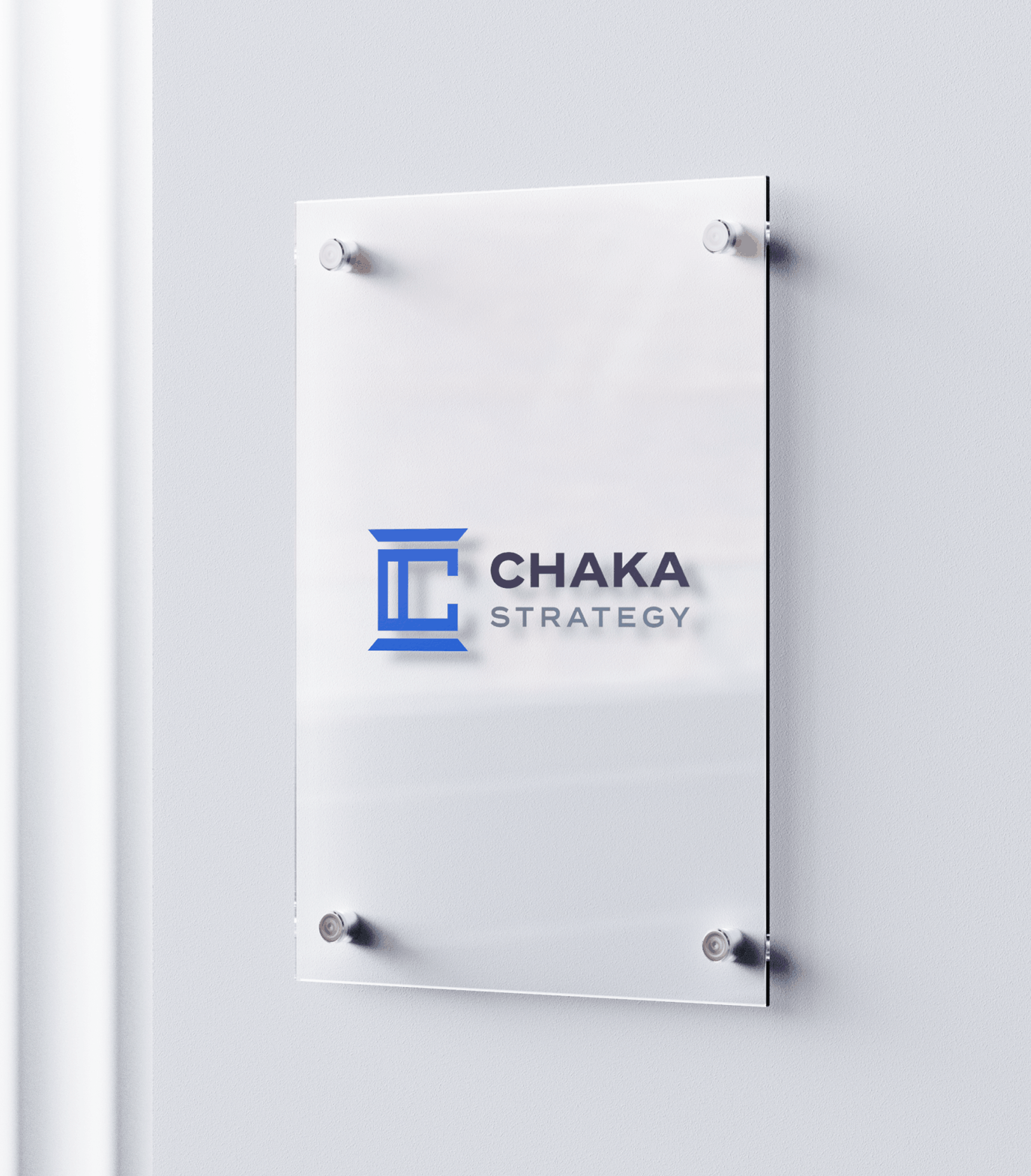 Chaka selected a modern column mark that reads instantaneously as legal authority, with a subtle “C” built into the negative space. It positions ChakaStrategy as steady, institutional, and trusted—perfect for pitches, contracts, and high-stakes client touchpoints. The mark works as both an emblem for documents and a concise icon for digital use, giving the brand a single visual shorthand that aligns with the firm’s executive voice.