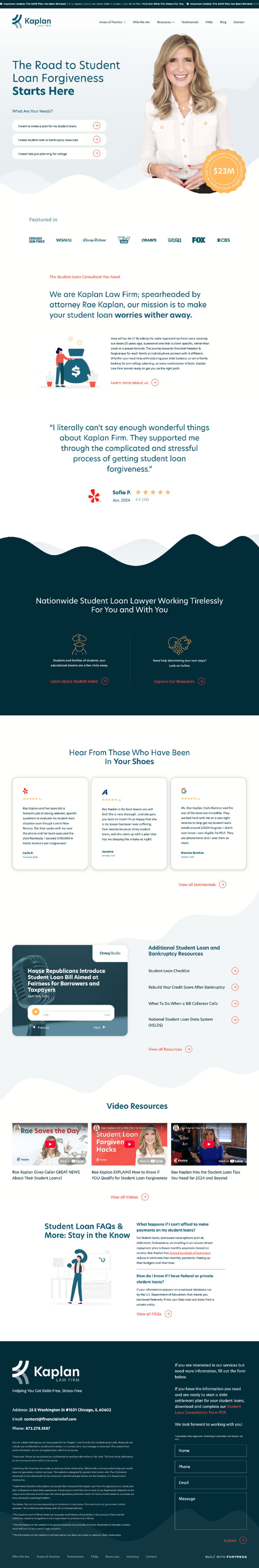 Fortress partnered with Kaplan Law Firm to elevate their online presence and position founder Rae Kaplan as a leading authority in the complex world of student loan law. We developed clear, SEO-driven website content that not only explained intricate topics like the SAVE plan, PSLF, and loan forgiveness in plain language, but also highlighted Rae’s proven track record—over $19 million in student loans forgiven for clients. By combining educational resources, compelling calls to action, and trust-building testimonials, we created a digital platform that attracts high-intent borrowers and converts them into consultations, reinforcing Kaplan Law’s reputation as the go-to resource for navigating ever-changing student loan policies.
